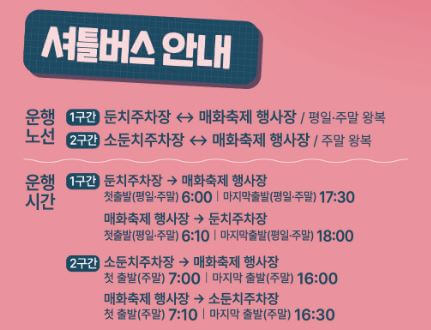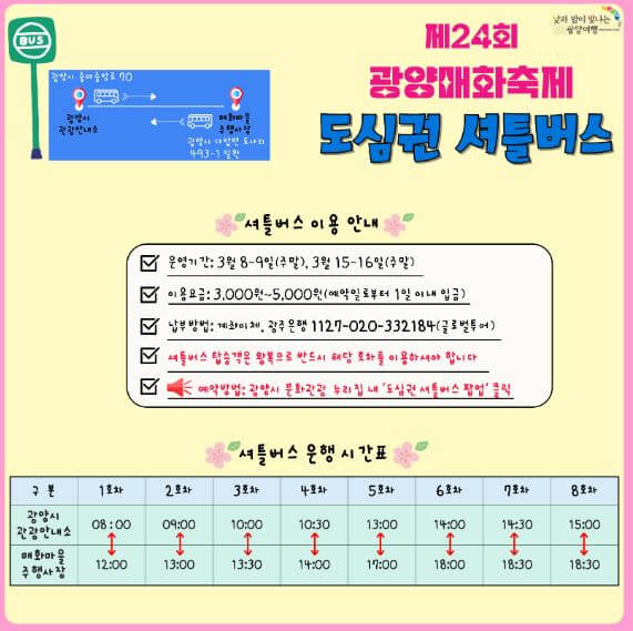 축제 기간 동안 무료 셔틀버스가 광양 시내 주요 지점에서 운행됩니다.