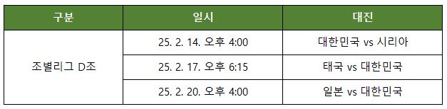 대한민국은 D조에 속해 있으며, 같은 조에는 일본, 시리아, 태국이 포함되어 있습니다.